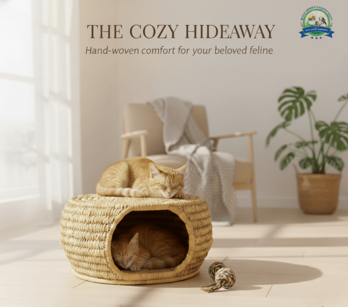 Handmade natural handicraft cat house. Strong, safe & cozy for your pet. Perfect for resting and hiding. Easy to place anywhere in your home.